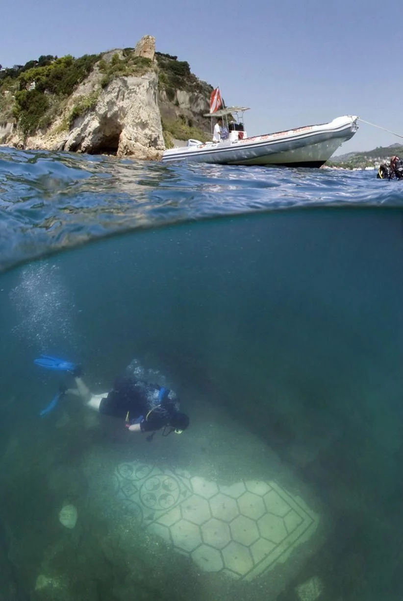 如今,这座水下古城已经对外开放,游客可以潜水参观。近日,当地摄影师Antonio Busiello潜入水下,拍摄了这座古城的照片,其中可以看出,道路、城墙、镶嵌图案、雕像等等,都保存地相当不错,没有被海水和岁月严重侵蚀。