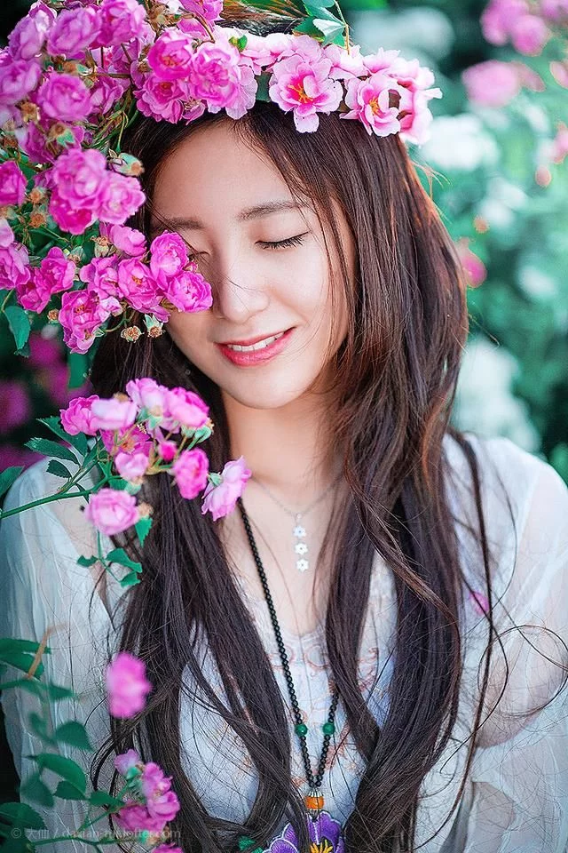 亲近自然,花草式,脸庞与花草来个亲密接触会更显气质。
